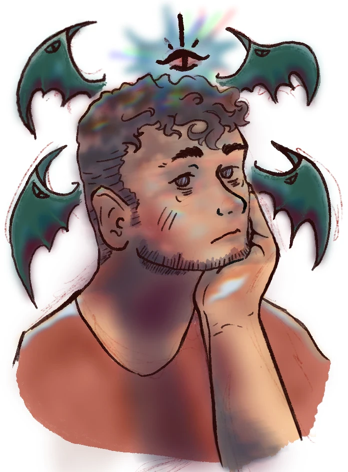 Finding inspiration in the re drawing of a self portrait in the original image I experimented and made a human x demonic-biblical angel and re vitalized the idea this time leaning into the biblical angel as the old image felt dark and muddied.